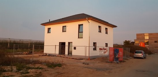 Die Bauherren haben quirlige Zwillinge im Alter von Zweieinhalb Jahren und eine 11-jährige Tochter. Damit sie sich bei dem Bau um nichts kümmern müssen, haben sie das „Freizeitpaket“ gebucht. Von drei möglichen Haustypen haben sich Nicole und Andreas für die Stadtvilla ohne Klinker entschieden. Bei der Planung sind sie sorgfältig vorgegangen, haben viel überlegt, gezeichnet, sich die Nächte um die Ohren gehauen und alles viele Male Revue passieren lassen. Schließlich baut man nicht jeden Tag. Bei der Raumplanung haben sie bereits an die Zukunft und unterschiedliche Wohnbedürfnisse gedacht. Jetzt gibt es zwei Kinderzimmer und ein Büro, später dann drei Kinderzimmer, wenn die Zwillinge größer sind und ihr eigenes Zimmer haben wollen. Leere Räume sind zu teuer. Den Grundriss haben sie auch ein wenig geändert und das Haus um 90 Grad gedreht. Im Schlafzimmer haben sie eine offene Ankleide, im Gäste WC im Erdgeschoss eine Dusche möglich gemacht. Diese Extras haben sie dazu gekauft. Bei der Vertragsunterzeichnung gab es einen Begrüßungsgutschein, den die Bauherren für Extraleistungen genutzt haben.